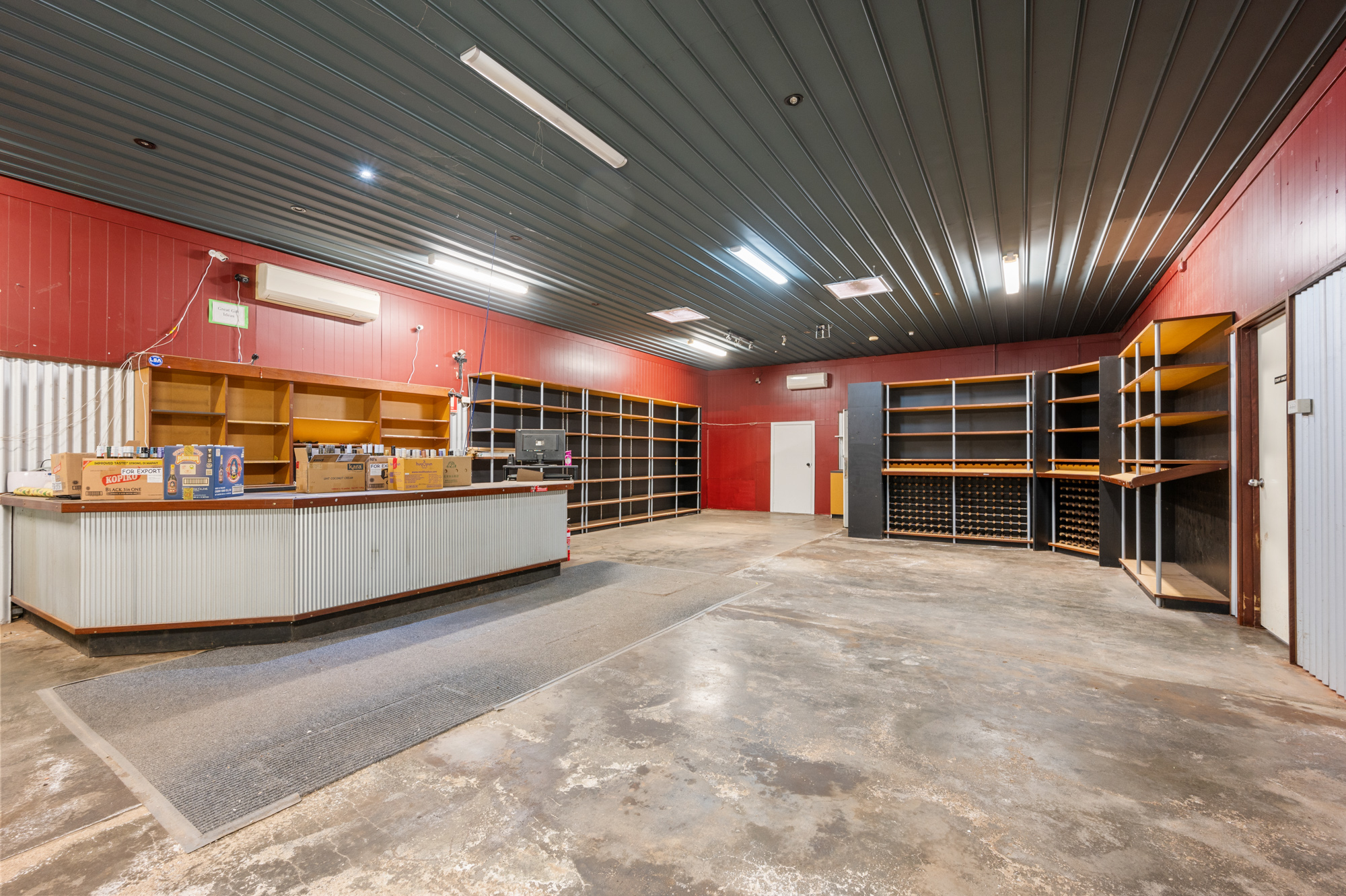 220m² versatile area formerly used as a liquor store and now transformed into an ultimate man cave or second living room Includes two fully functional cool rooms, ideal for wine storage or personal use Features shelving, a counter, and a chiller