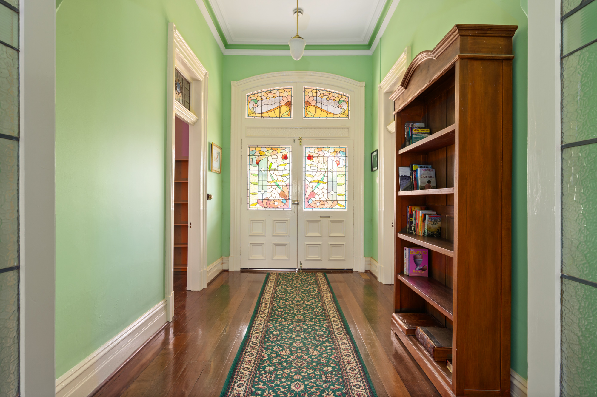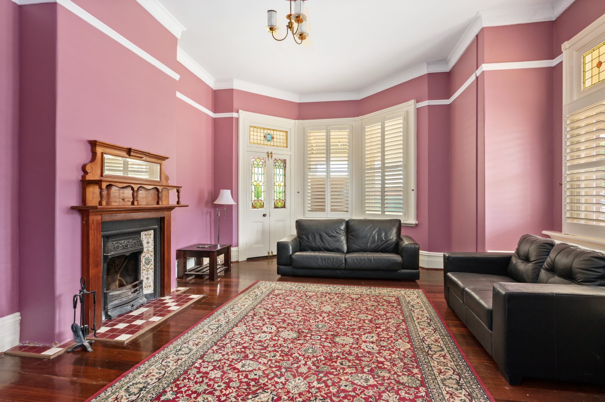 A separate formal lounge area with original fire place, plantation shutters and beautiful stain-glass window assents with French doors accessing the wrap around verandah.