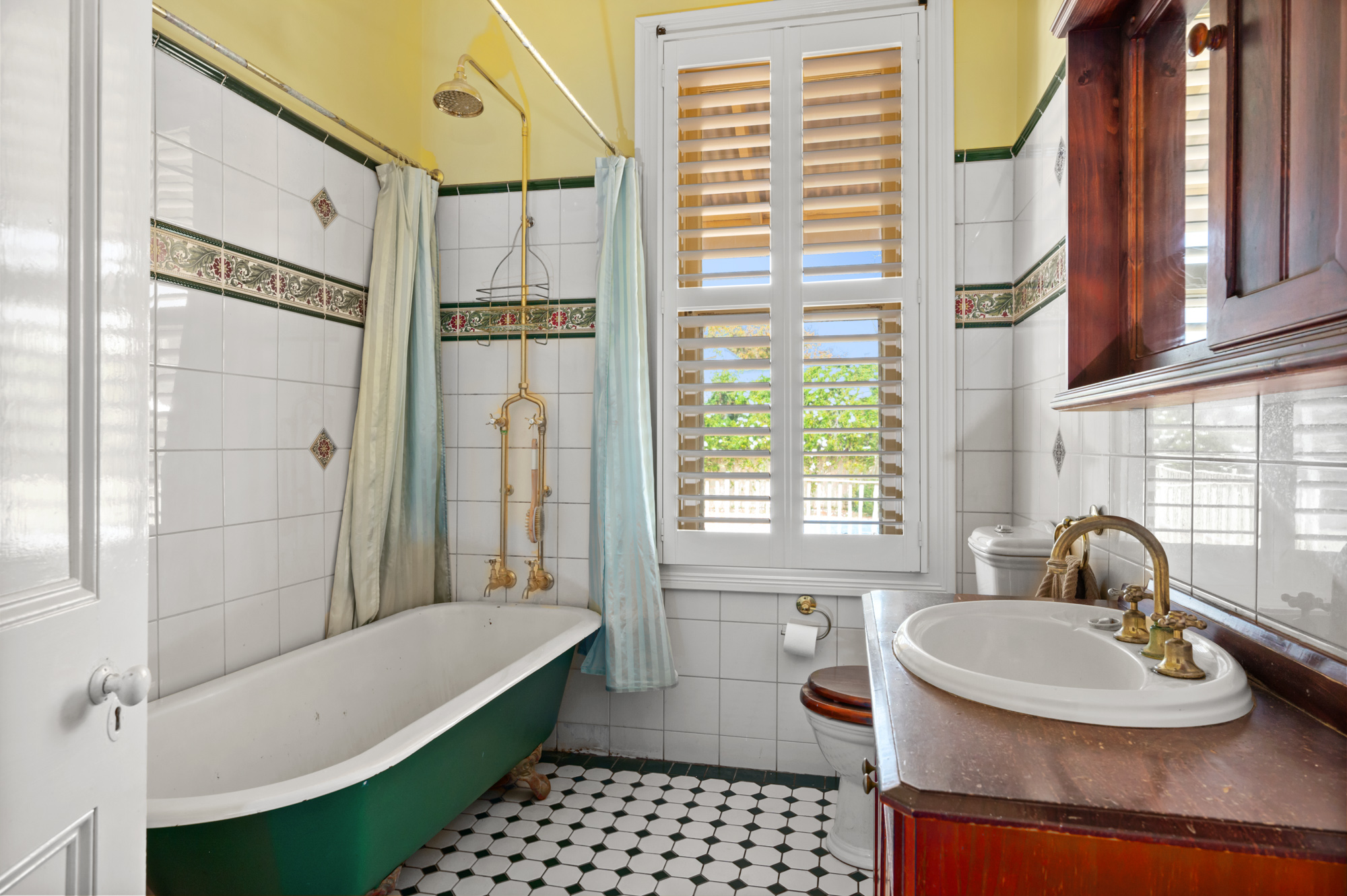 The main bathroom holds original character charm, with a claw foot bath tub, brass pipes and feature tiles.