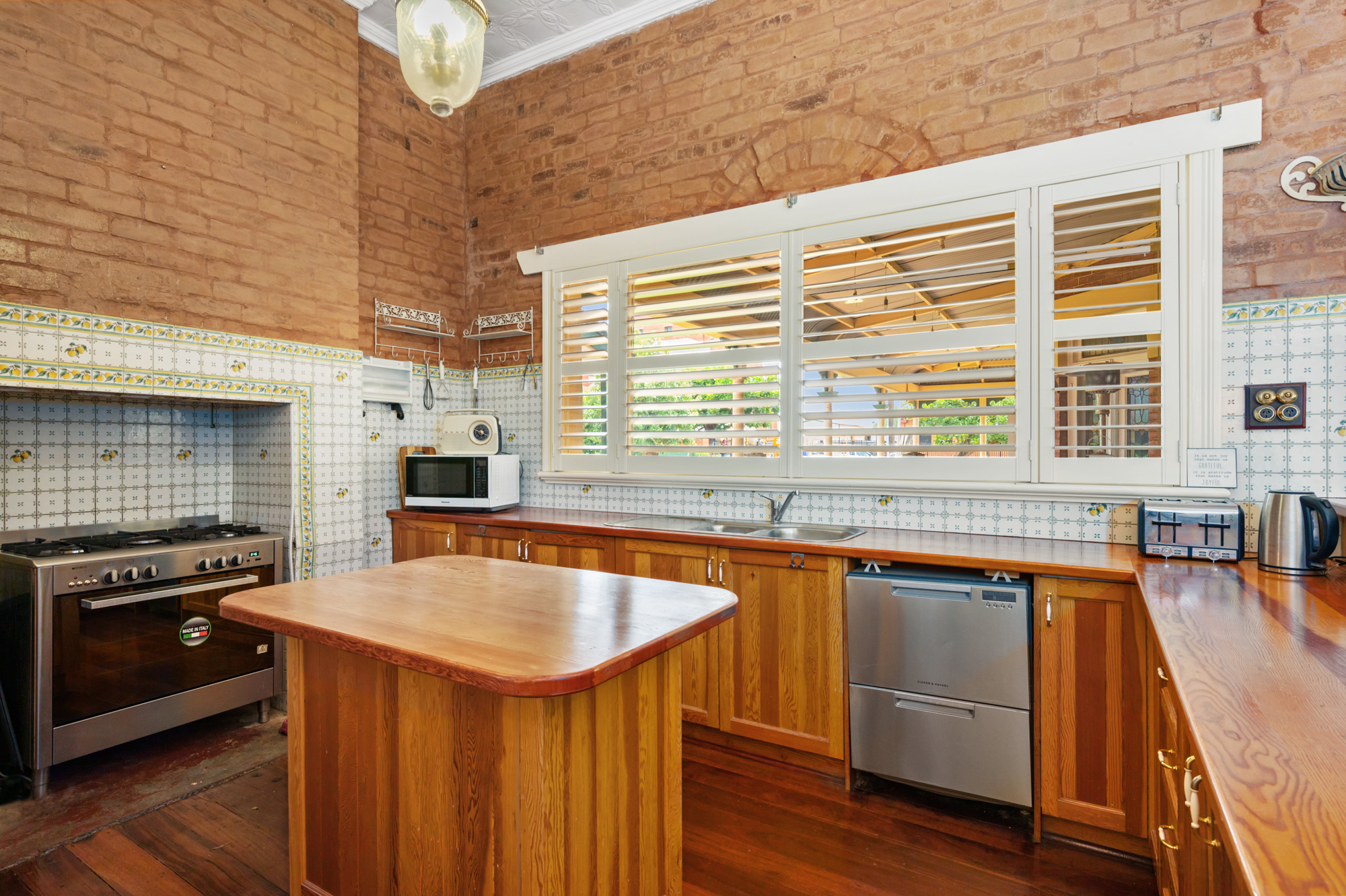 The spacious timber kitchen, with exposed brick features overlooks the meals area, with a wood fire and views outside to the below ground swimming pool.